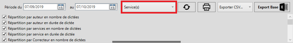 La liste déroulante nommée "Service(s)", située dans la barre d'outils permet définir le ou les services pour lesquels extraire les statistiques :